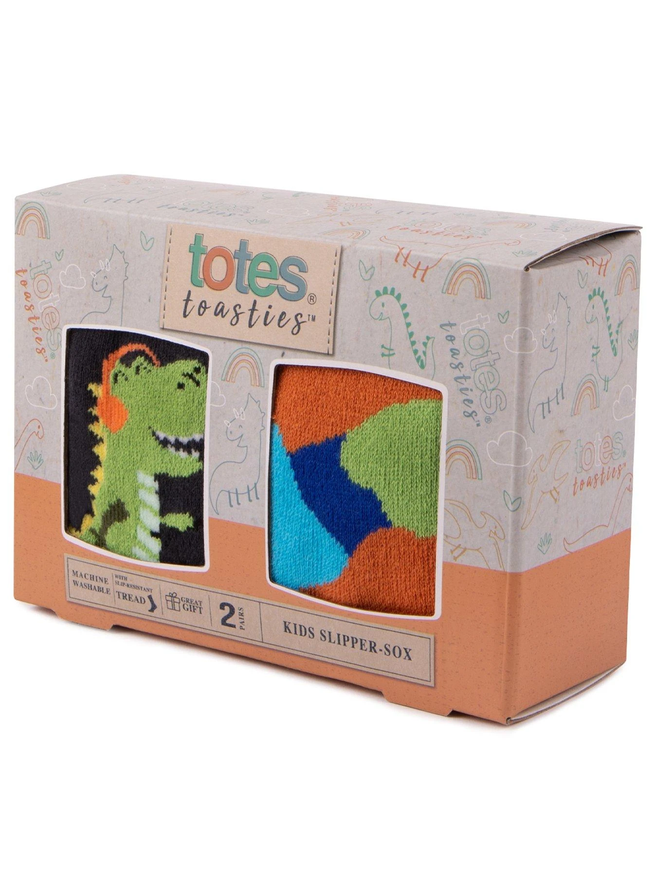 Rooooaaaarrrr – only friendly dinosaurs live in our lovely packaging! In a handy twin pack featuring a smiley dinosaur and a bright camouflage design – all on our totes toasties terry lined slipper-sox with famous slip-resistant tread. Characterful novelty dinosaur designs. Handy twin pack. Machine washable at 30°. Beautifully packaged for the perfect gift.