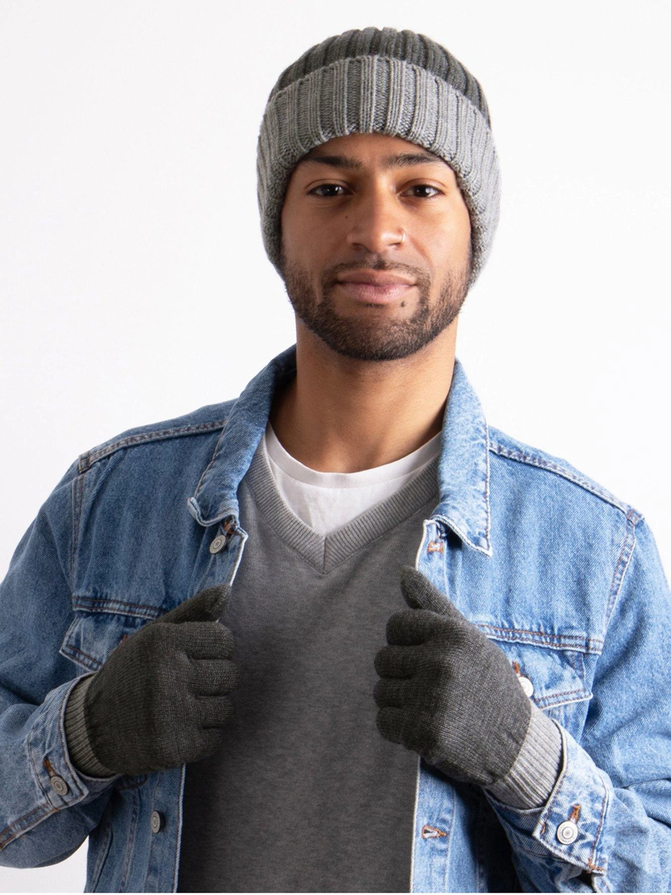 Beating winter’s chills in style! Classic knitted beanie style hat in a grey marl matched with warm gloves for a perfect winter boost. Chunky textured rib knit. One size fits most. Beautifully packaged for the perfect gift.