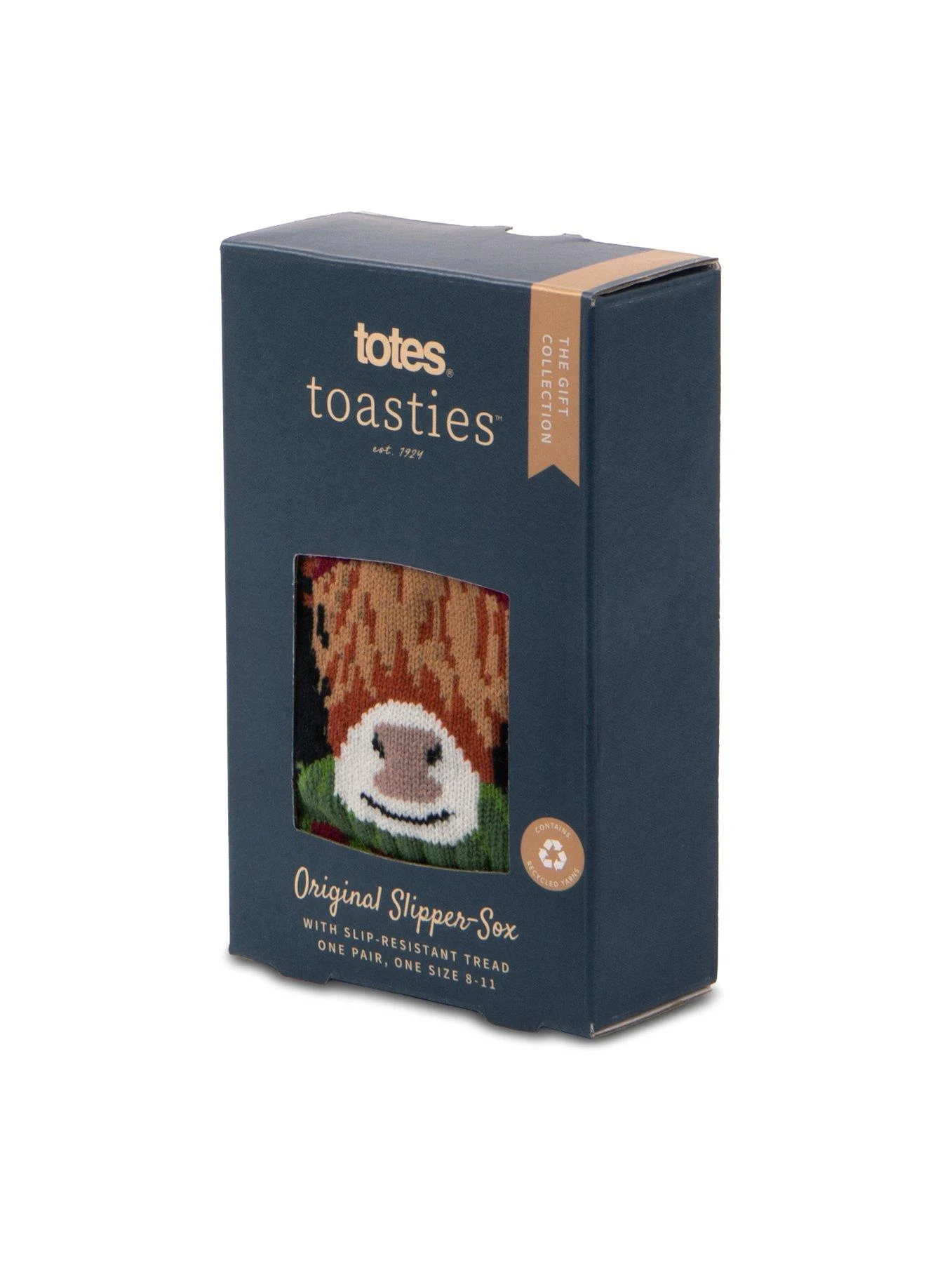 A novelty highland cattle design decorates these totes toasties Originals slipper socks in a single pack. With slip-resistant tread, of course. Contains recycled yarns. One size fits most. Beautifully packaged for the perfect gift.