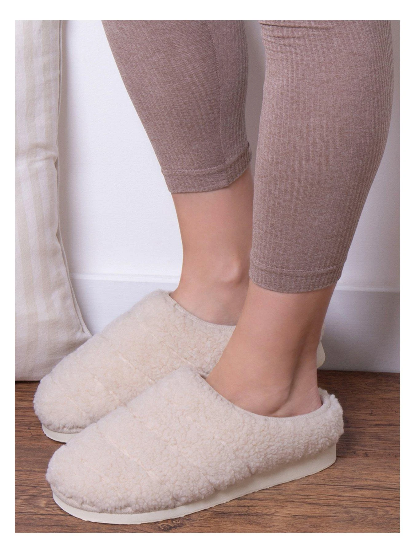In a gorgeously decadent quilted borg fabric with a lovely warm lining, these are exactly what chilly feet have been crying out for! A casual mule style in a soft cream shade to co-ordinate with your comfiest indoor winter cosies. Chunky quilted borg mule style. Warm and cosy lining and underfoot. Durable sole. Beautifully packaged for the perfect gift.