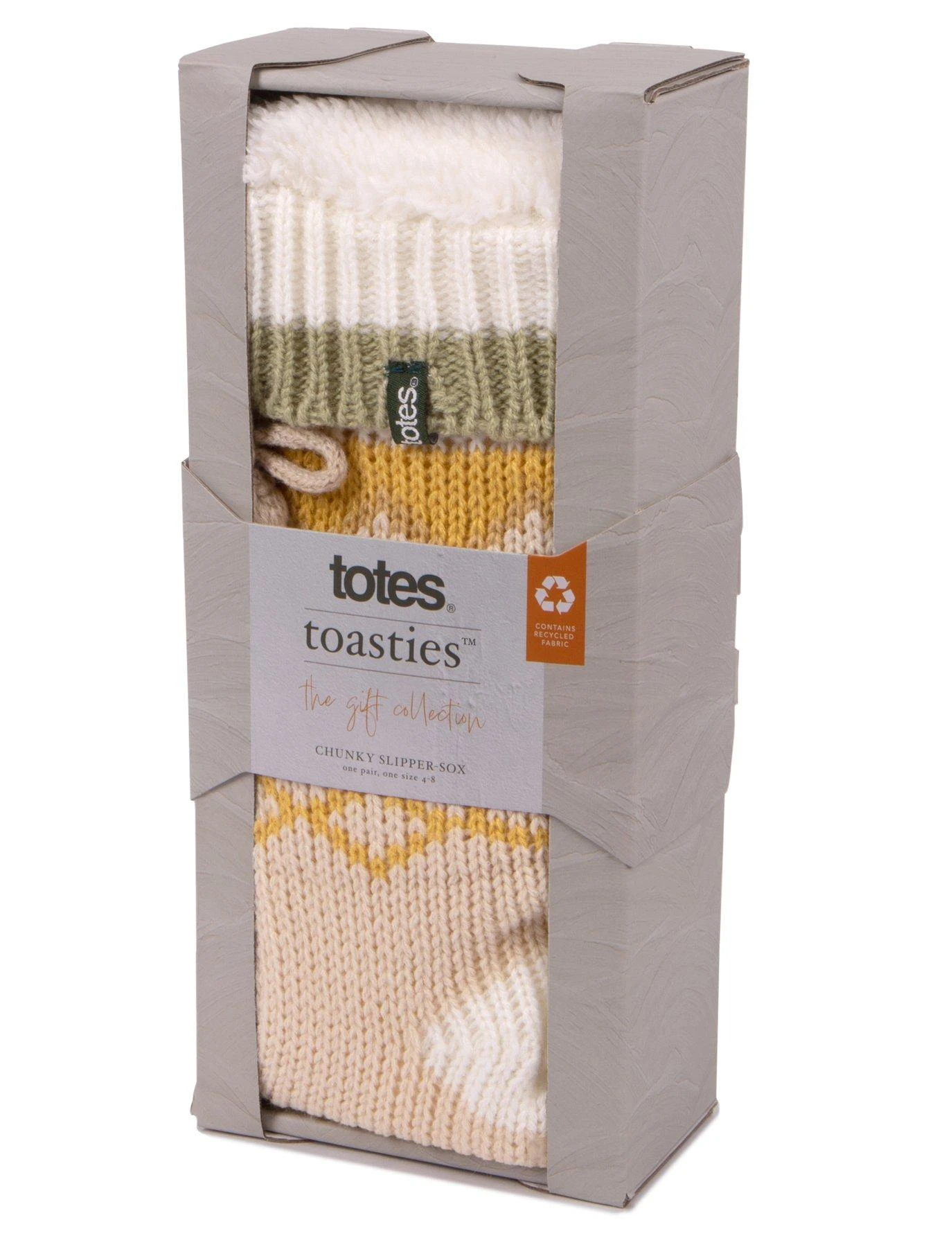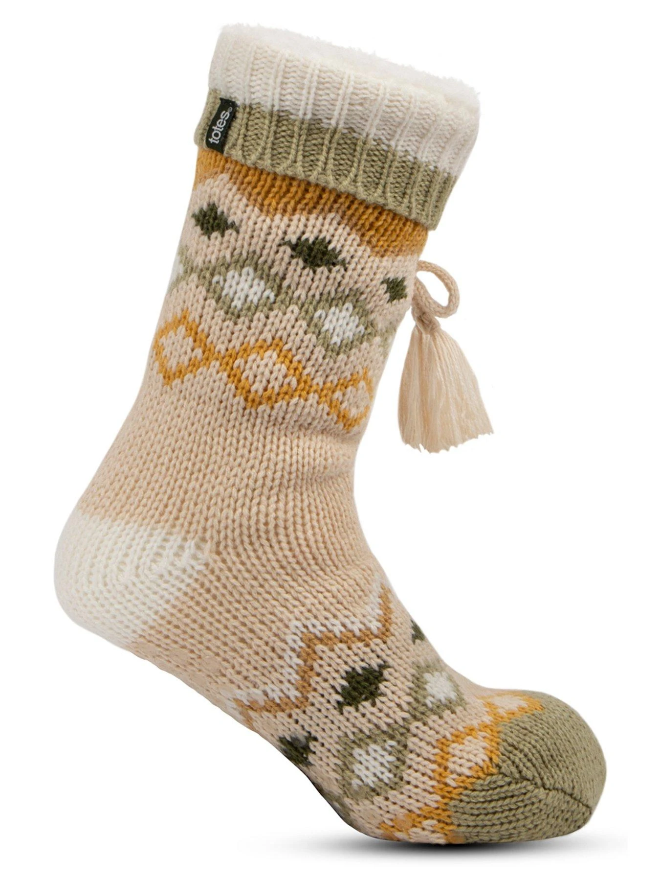 Seasonal Fair Isle is the perfect choice for these lovely totes toasties slipper-sox. In tones of olive green, beige and orange with a warm sherpa lining and tassel tie side trim, they’ll take you effortlessly from comfy to cosy and all the way back again! Warm and cosy sherpa lining. Slip-resistant tread. Contains recycled fabric. One size fits most.