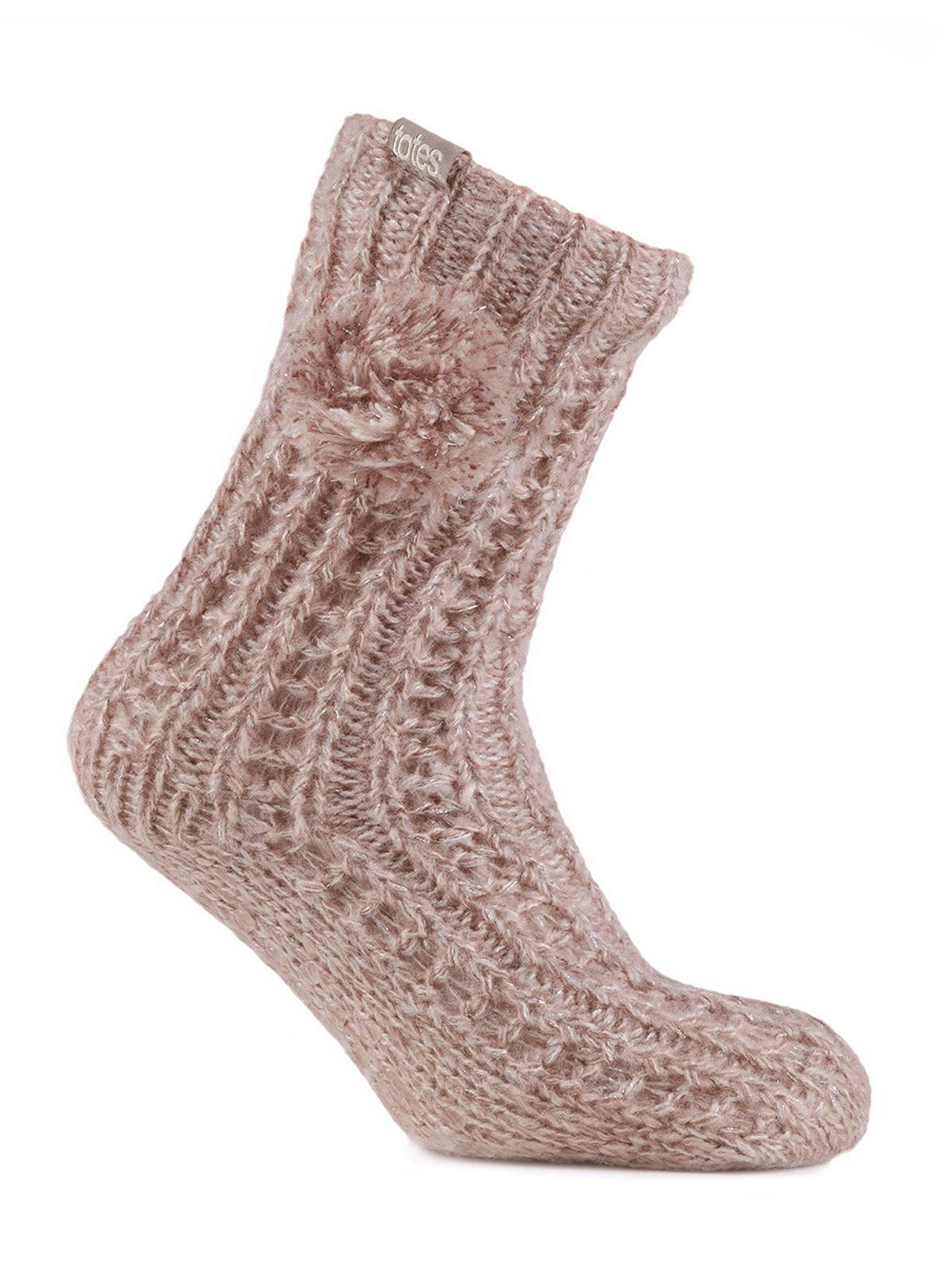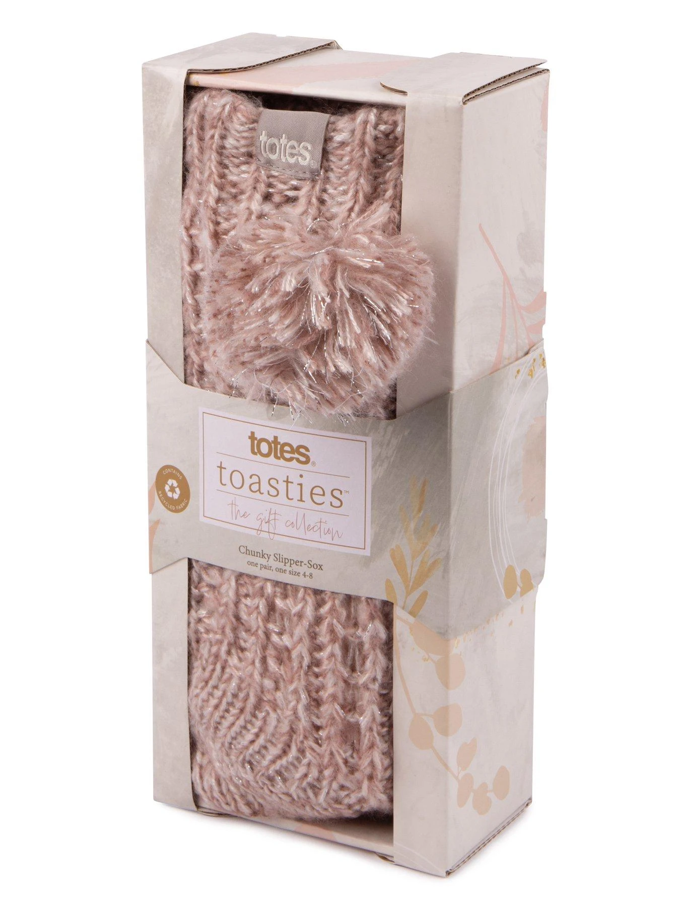Luxury abounds in these cosy, warm totes toasties slipper-sox with sherpa lining and a dash of festive sparkle! In a soft pink knit with a slip-resistant tread (obviously) team them with your favourite winter cosies for relaxing indoor days this winter. Sparkly knit design. Warm and cosy sherpa lining. Slip-resistant tread. Contains recycled fabric. Beautifully packaged for the perfect gift.