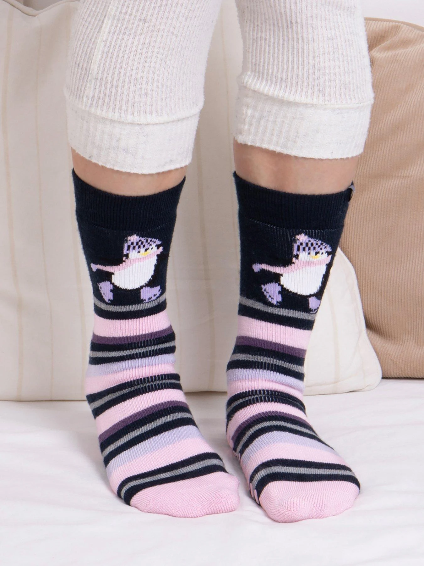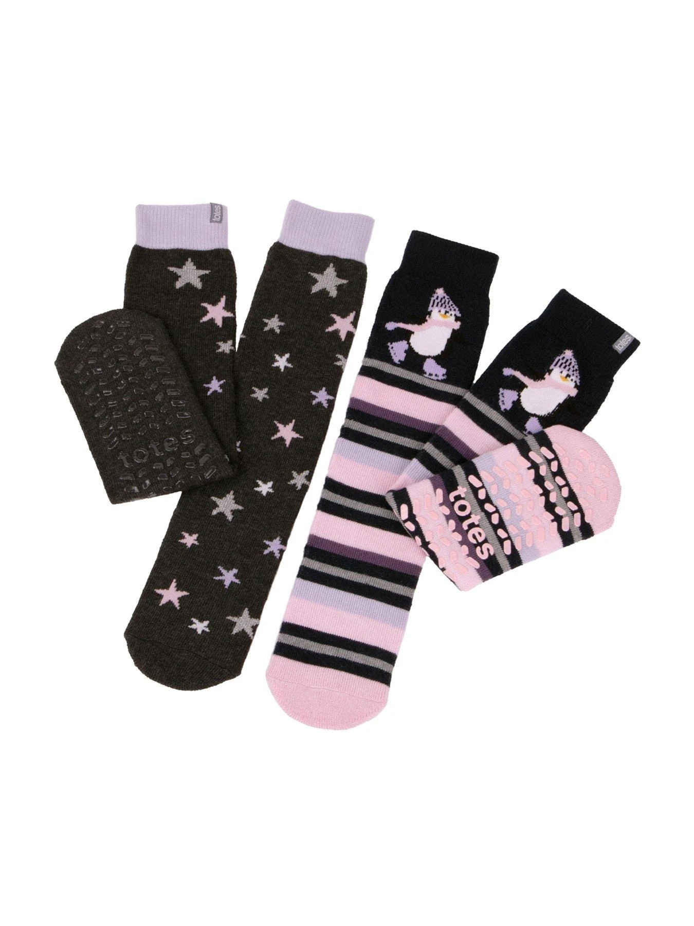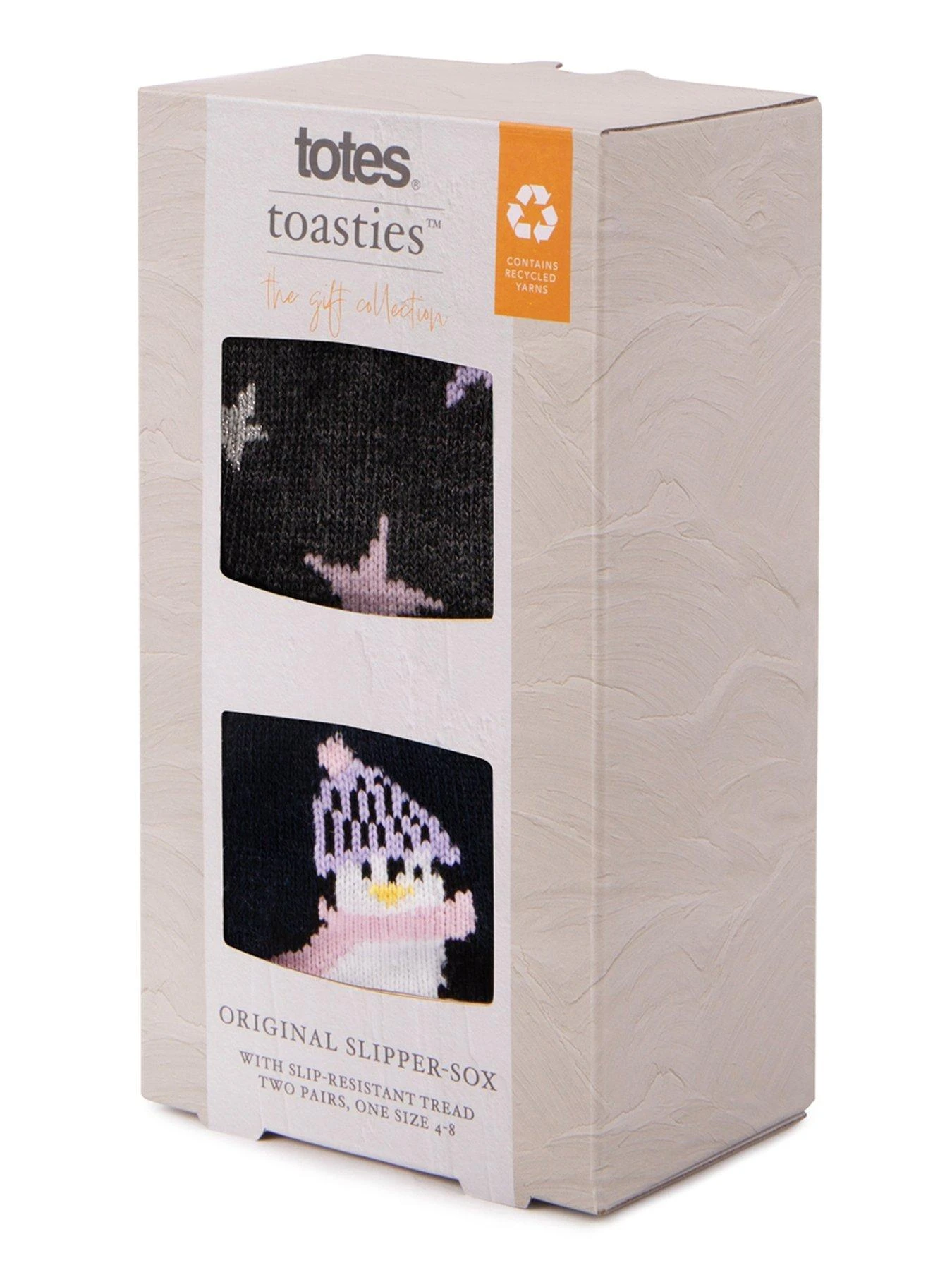 Two pairs of treaded slipper-sox in a variety of designs. Stars and stripes in tones of blue, lilac and pastel pink. Winter footwear for a night in absolutely sorted! Twin pack for value. One size fits most. totes slip-resistant tread. Machine washable at 30°. Beautifully packaged for the perfect gift.