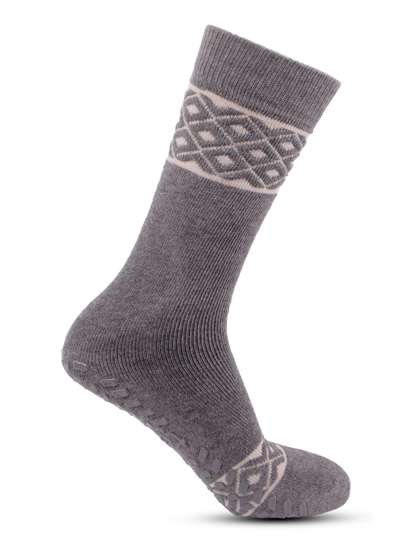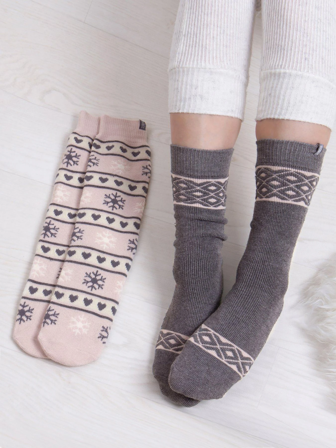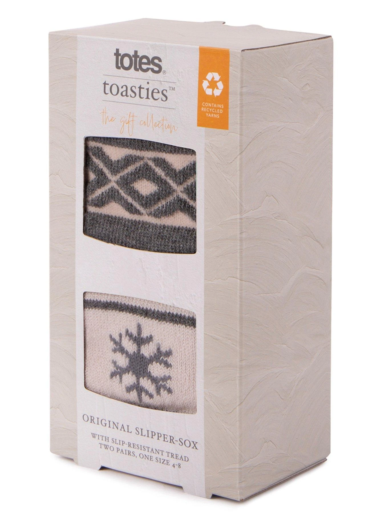 Two pairs of treaded slipper-sox in a variety of designs. Fair Isle in pale pastel pink and soft grey. Winter footwear for a night in absolutely sorted! Twin pack for value. One size fits most. totes slip-resistant tread. Machine washable at 30°. Beautifully packaged for the perfect gift